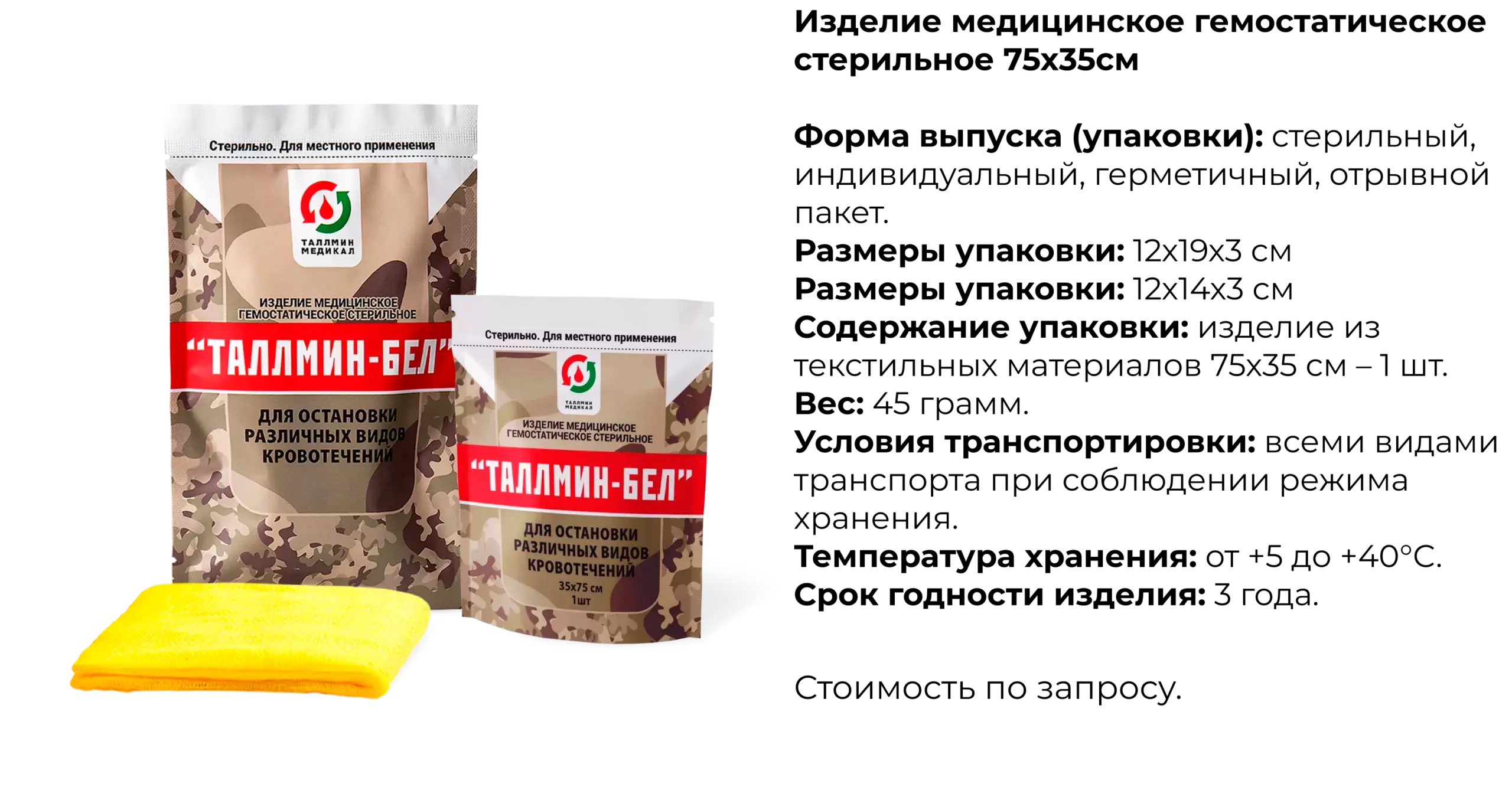 “ТАЛЛМИН-БЕЛ” является местным кровоостанавливающим средством, представляющим собой изделие из текстильных материалов, пропитанных специальным гемостатическим раствором, разработанным специалистами ООО “ТАЛЛМИН МЕДИКАЛ”.